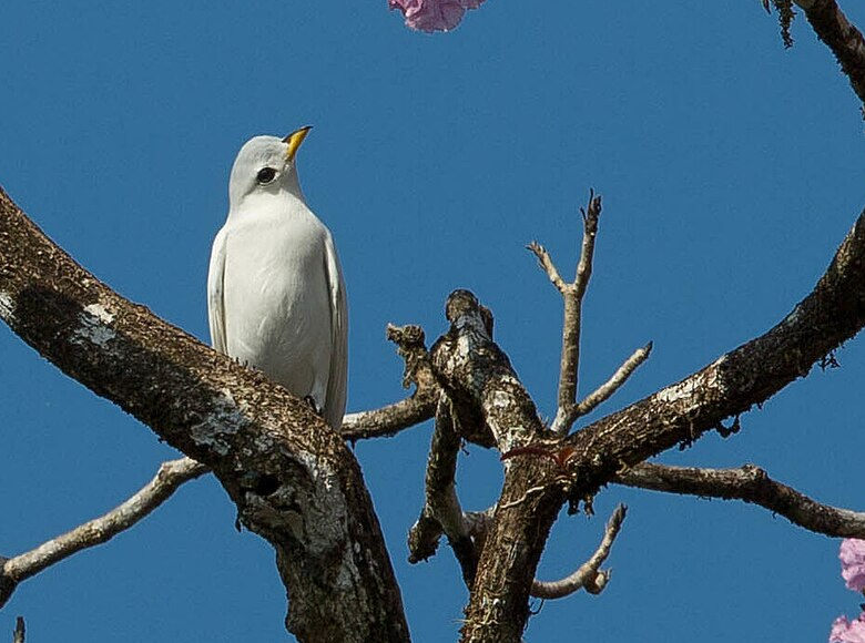 This cute little white number from Softbank is interesting, particularly because all-white is a pretty rare colour scheme for songbirds (which this clearly is). My thoughts immediately jumped to Snowy Cotinga, but the yellow bill again puts us in an awkward spot. Imagine, then, my elation when I discovered that Snowy Cotinga has a cousin named Yellow-billed Cotinga. You’ll never guess what sets them apart.
